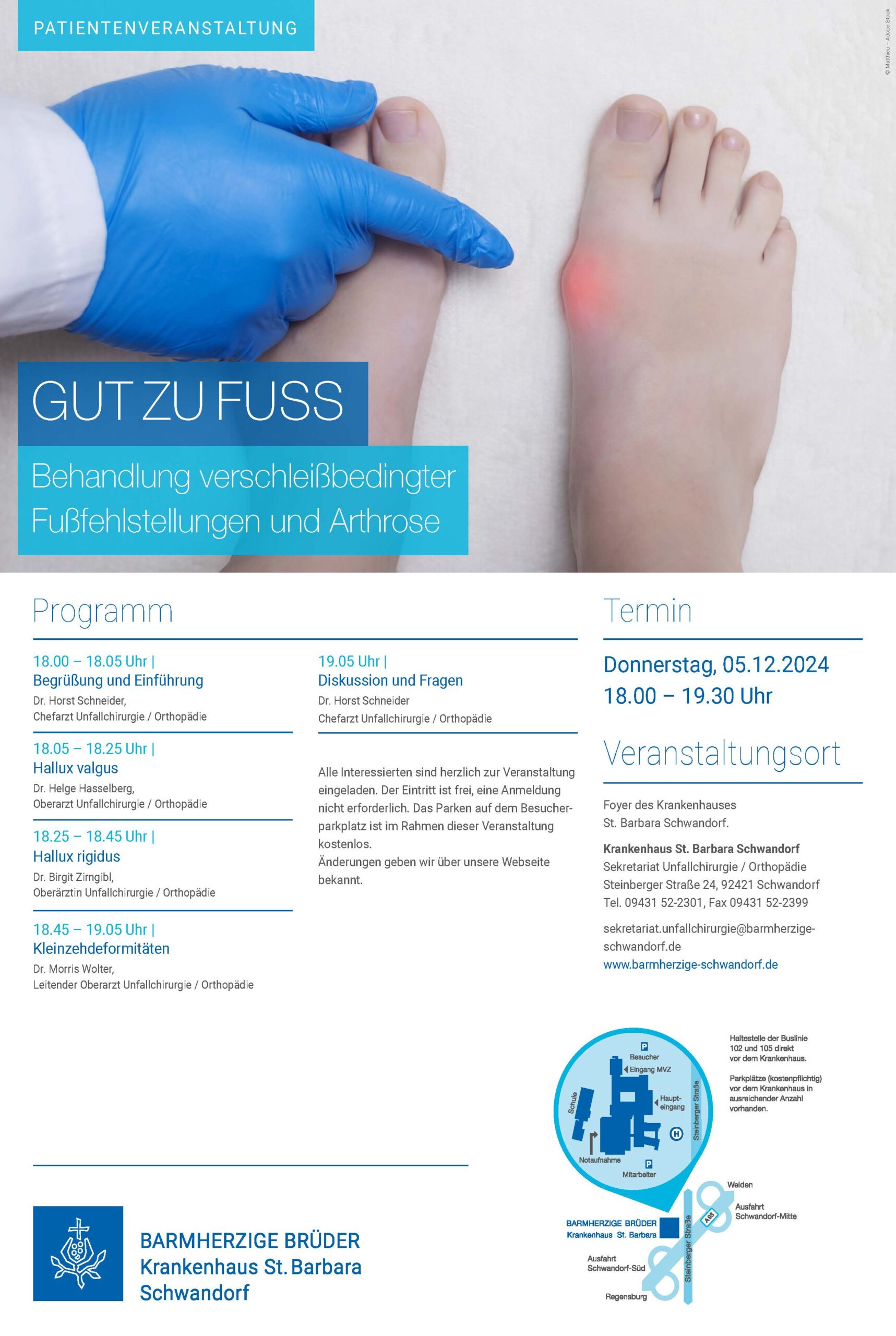 Das Patientenforum findet im Foyer des Barmherzige Brüder Krankenhauses St. Barbara Schwandorf statt. Die Teilnahme an der Veranstaltung ist kostenfrei, eine Anmeldung ist nicht erforderlich. Besucher können ihr Ticket für den Besucherparkplatz gratis freischalten lassen. „Mit diesem Forum möchten wir Menschen in unserer Region dabei unterstützen, ihre Fußgesundheit zu verbessern und so ihre Lebensqualität zu steigern“, sagt Dr. Schneider. „Unser Ziel ist es, Betroffene frühzeitig zu informieren und ihnen durch gezielte Behandlung zu einem schmerzfreien Alltag zu verhelfen.“