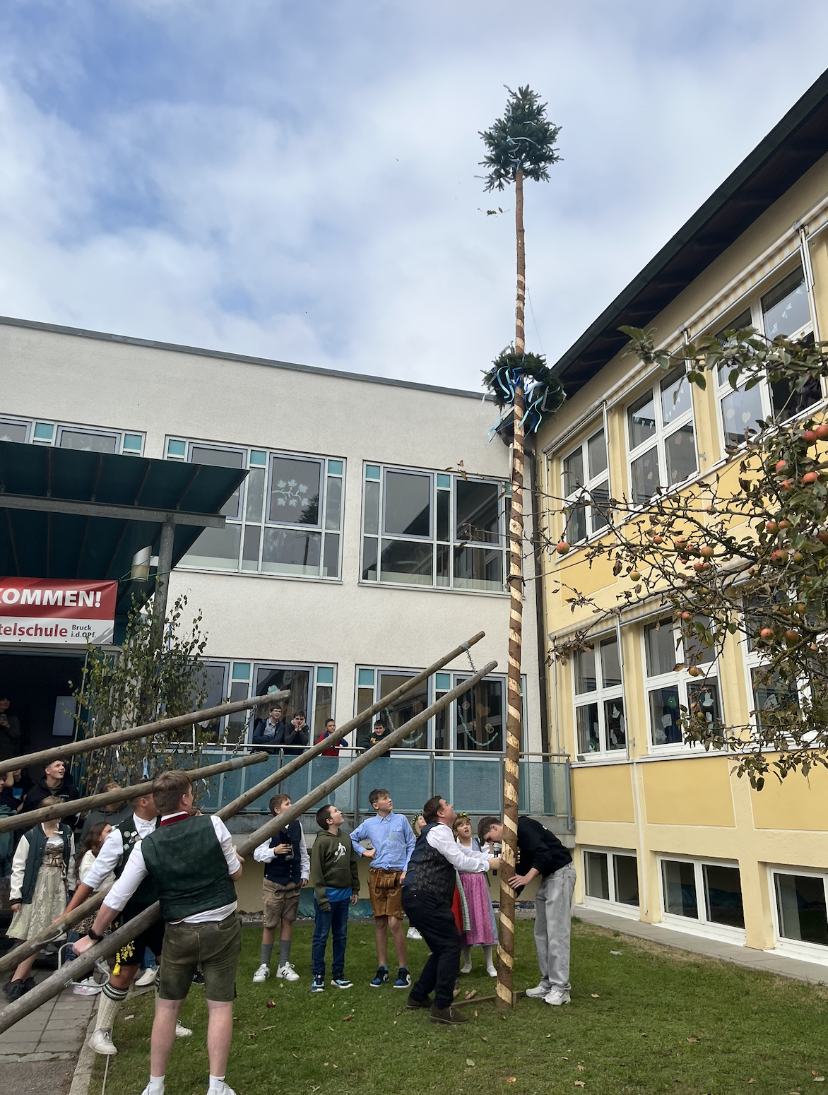 Unter diesem lauten „Schlachtruf“ startete die gesamte Schulfamilie der Grund- und Mittelschule Bruck ihre bereits traditionelle Kirchweih-Feier eine Woche vor dem eigentlichen Termin. Konrektorin Sonja Mühlbauer stimmte alle Teilnehmenden in der Turnhalle mit einem kurzweiligen, informativen Vortrag über Geschichte und Herkunft der Kirchweih auf den Tag ein und hisste dabei auch den „Zacherl“, die traditionelle Kirchweih-Fahne. Anschließend begaben sich die Schülerinnen und Schüler der Brucker Schule und die Viertklässler der Grundschule Bodenwöhr, die ebenfalls zur Kirwa eingeladen waren, auf eine Reise zu bayrischen Traditionen und kreativen Arbeitsgruppen durchs Schulhaus. In verschiedenen Workshops, die von den Lehrkräften der Grund- und Mittelschule, aber auch von Brucker Vereinen wie dem Musikverein, dem Trachtenverein Enzian und der Feuerwehr angeboten wurden, durften sie ihre Kenntnisse zu den bayrischen Traditionen erweitern – oder sie gleich ausprobieren! Sie erfuhren viel Wissenswertes zu Kirchweihliedern, bayrischen Tänzen oder zum Kartenspiel „Watten“, verausgabten sich beim Maßkrug-Stemmen, Hackstocknageln und bayrischem Maßkrug-Schieben. Außerdem bereiteten die Jugendlichen Köstlichkeiten für die Kirchweihfeier vor, bastelten bayerische Windlichter, Namens-Wäscheklammern, Nagelbilder und Vieles mehr. Krönung des Tages war dann die gemeinsame Feier im Pausenhof, zu der auch die ganze Bevölkerung eingeladen war und bei der mit vereinter „Manpower“ der Kirwabaum aufgestellt wurde, der von den Schülern der Technik-Gruppe selbst gefertigt und mit dem Wappen der Schule verziert worden war. Nachdem der Schulleiter Markus Binder gemeinsam mit der Schulverbandsvorsitzenden und Bürgermeisterin Heike Faltermeier die Anwesenden begrüßt hatte, wurden einstudierte Lieder und bayerische Tänze zum Besten gegeben. Dazu war wiederum auch der stellvertretende Bezirksheimatpfleger, Florian Schwemin, mit dem Heimatmobil des Bezirks Oberpfalz an die Schule gekommen, und unterstützte die Singenden und Tanzenden mit Gitarre und Quetsche. Für das leibliche Wohl war ebenfalls bestens gesorgt: Der Elternbeirat wartete mit einem kulinarischen Angebot auf, das mit Würstelsemmeln, Schnittlaubroten und diversen traditionellen Kirwa-Gebäcken keine Wünsche offenließ. Zu guter Letzt wurden noch die Champions der bayrischen Traditionswettkämpfe bekanntgegeben und ein Match zwischen Schüler- und Lehrermannschaft ausgetragen. Der Schulleiter Markus Binder entschied beim Maßkrugstemmen – einer Disziplin, bei der man einen gefüllten Maßkrug mit ausgestrecktem Arm halten muss – den Wettkampf für die Lehrermannschaft! Das schreit nach einer Revanche im nächsten Jahr, die Niederlage tat der Feierlaune der Schüler jedoch keinen Abbruch.